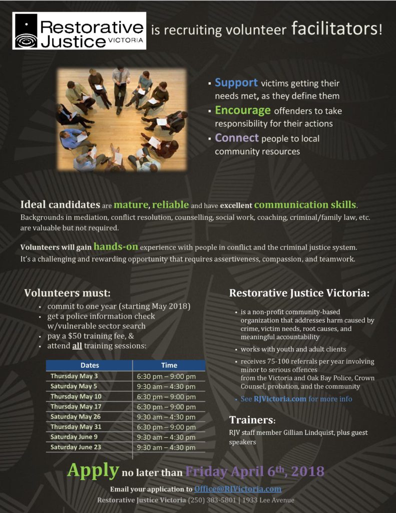We’re Recruiting Volunteer Facilitators!   We’re looking for facilitators! Please see the poster and application below for more details. Send your application to Office @ RJVictoria.com by Friday April 6th, 2018. We’d love your help spreading the word to anyone who you think may be a good fit 🙂 We’ve also posted it on Facebook and Twitter (@RestorativeYYJ) – shares and